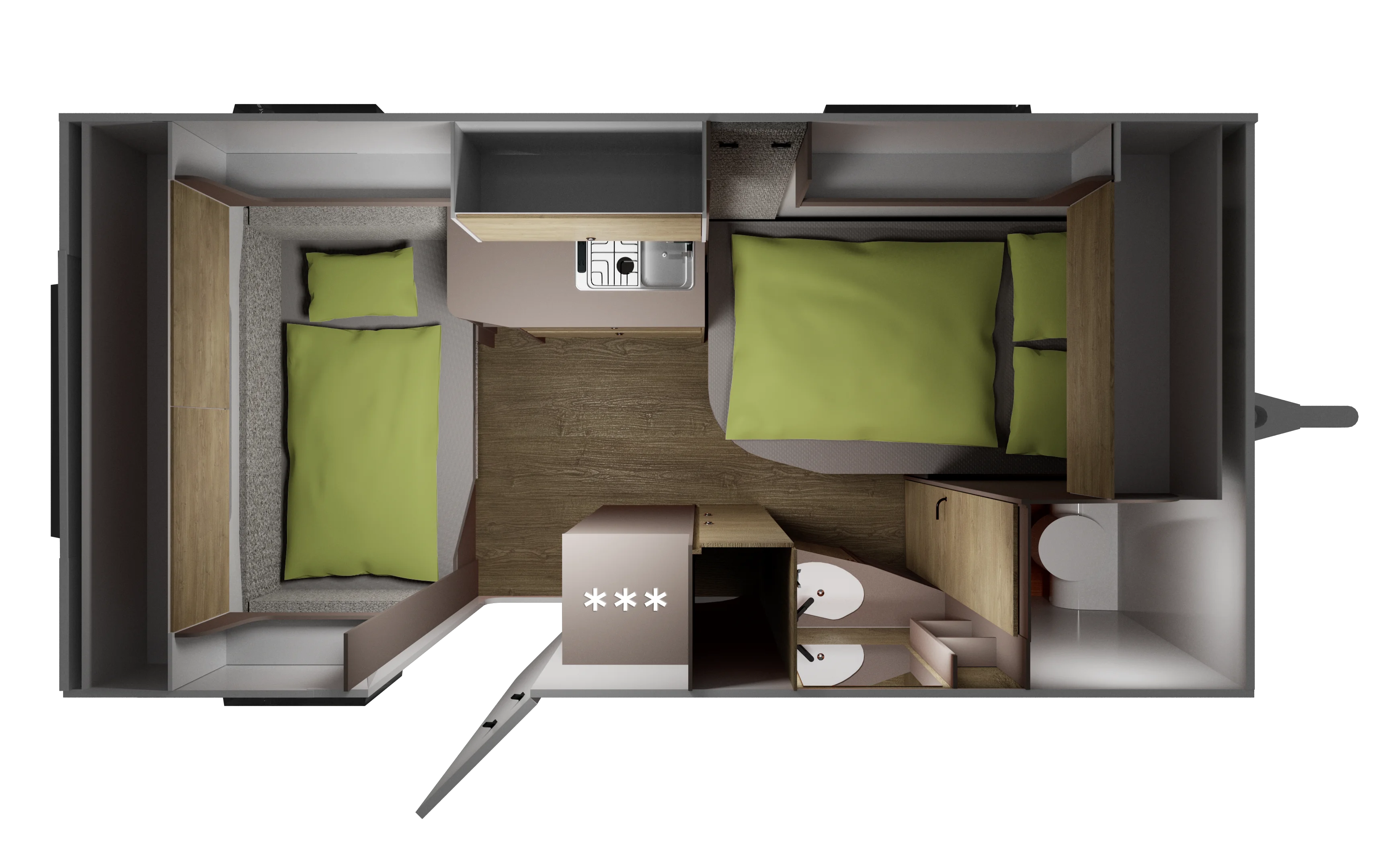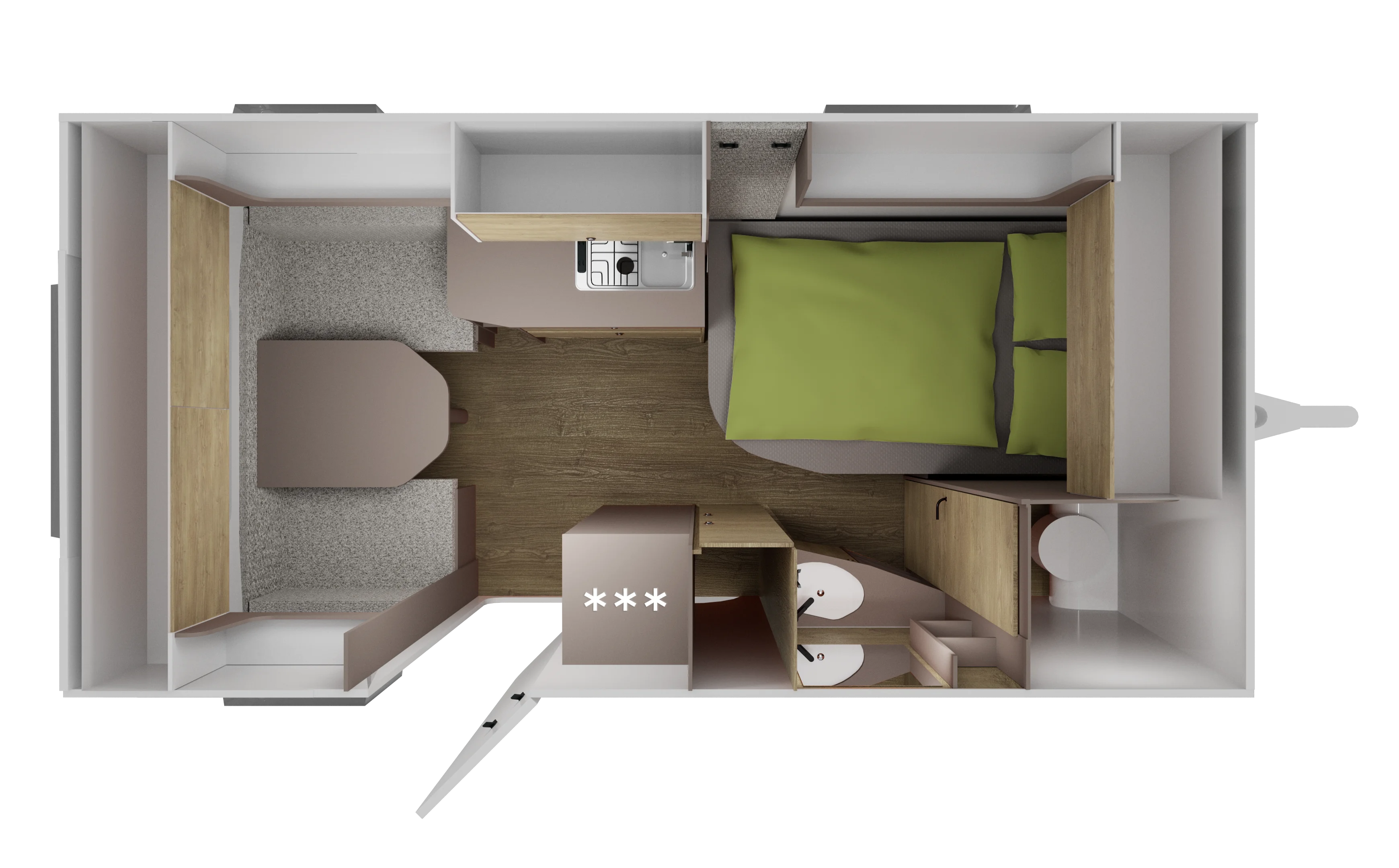 Mała przyczepa kempingowa dla 2 do 3 osób oferuje wszystko dla kempingu generacji NEXT: stabilne podwozie, dobrą izolację, zbiornik świeżej wody z zewnętrznym napełnianiem, ogrzewanie, część sypialną, funkcjonalny aneks kuchenny z płytą grzejną i miejscem do przechowywania, a także strefę mycia z toaletą.
